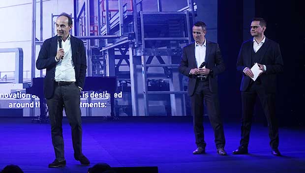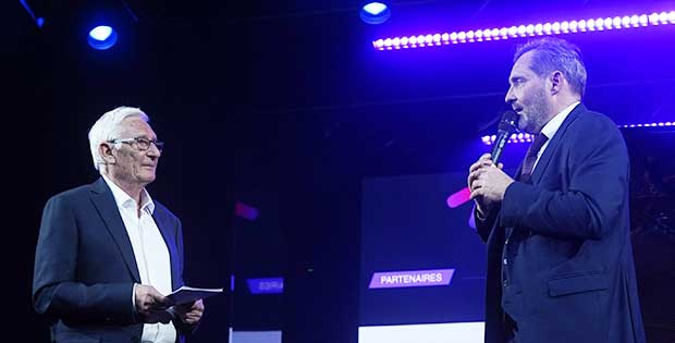 | 3. Dans la catégorie Intralogistique, Valéry Fénès, président d’Arefim et et Jérôme Brulon ont remis l’Award à la société Enjoy Automation. |