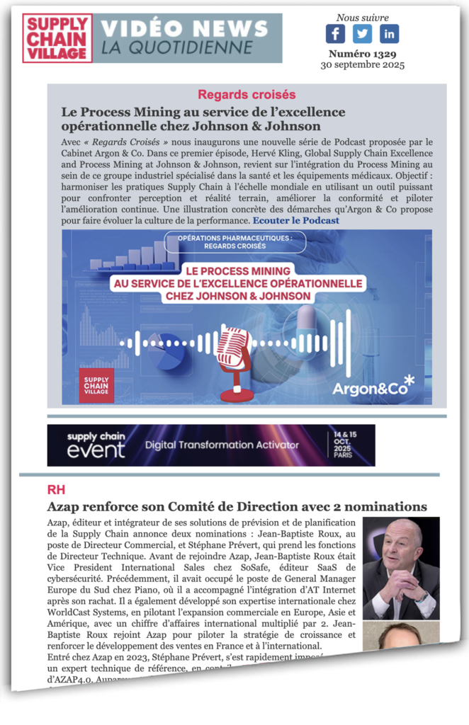 Azap, éditeur et intégrateur de ses solutions de prévision et de planification de la Supply Chain annonce deux nominations : Jean-Baptiste Roux, au poste de Directeur Commercial, et Stéphane Prévert, qui prend les fonctions de Directeur Technique. Avant de rejoindre Azap, Jean-Baptiste Roux était Vice President International Sales chez SoSafe, éditeur SaaS de cybersécurité. Précédemment, il avait occupé le poste de General Manager Europe du Sud chez Piano, où il a accompagné l’intégration d’AT Internet après son rachat. Il a également développé son expertise internationale chez WorldCast Systems, en pilotant l’expansion commerciale en Europe, Asie et Amérique, avec un chiffre d’affaires international multiplié par 2. Jean-Baptiste Roux rejoint Azap pour piloter la stratégie de croissance et renforcer le développement des ventes en France et à l’international. Entré chez Azap en 2023, Stéphane Prévert, s’est rapidement imposé comme un expert technique de référence, en contribuant activement à l’évolution d’AZAP4.0. Auparavant, il a travaillé près de 23 ans chez Winch, en tant que développeur pour des clients comme Schlumberger et Gallimard/Flammarion. Il y a acquis une solide expérience dans la conception et le développement de solutions logicielles complexes, en environnement C# et en méthodes agiles. En tant que Directeur Technique, Stéphane Prévert aura pour mission de piloter la stratégie produit, de renforcer l’innovation technologique et de superviser l’ensemble des développements logiciels. JPG