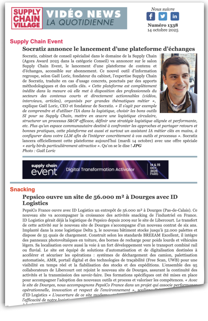 Socratiz, cabinet de conseil spécialisé dans le domaine de la Supply Chain (Agora Award 2025 dans la catégorie Conseil) va annoncer sur le salon Supply Chain Event, le lancement d’une plateforme de contenu et d’échanges, accessible sur abonnement. Ce nouvel outil d’information regroupe, selon Gaël Loric, fondateur du cabinet, l’expertise Supply Chain de Socratiz, traduite en cas d’usage concrets, ponctués par des apports méthodologiques et des outils clés. « Cette plateforme est complètement inédite dans la mesure où elle met à disposition des professionnels du secteurs des contenus courts et directement actionnables (vidéos, interviews, articles), organisés par grandes thématiques métier », explique Gaël Loric, CEO et fondateur de Socratiz. « Il s’agit par exemple de comprendre et d’utiliser l’IA dans la logistique, choisir les bons outils SI pour sa Supply Chain, mettre en œuvre une logistique circulaire, structurer un processus S&OP efficace, définir une stratégie logistique alignée et performante, etc. Plus qu’un espace communautaire destiné à confronter les approches et partager retours et bonnes pratiques, cette plateforme est aussi et surtout un assistant IA métier clés en mains, à configurer dans votre LLM afin de l’intégrer concrètement à vos outils et processus ». Socratiz lancera officiellement cette plateforme aujourd’hui (mardi 14 octobre) avec une offre spéciale « early birds particulièrement attractive ». Qu’on se le dise ! JPG