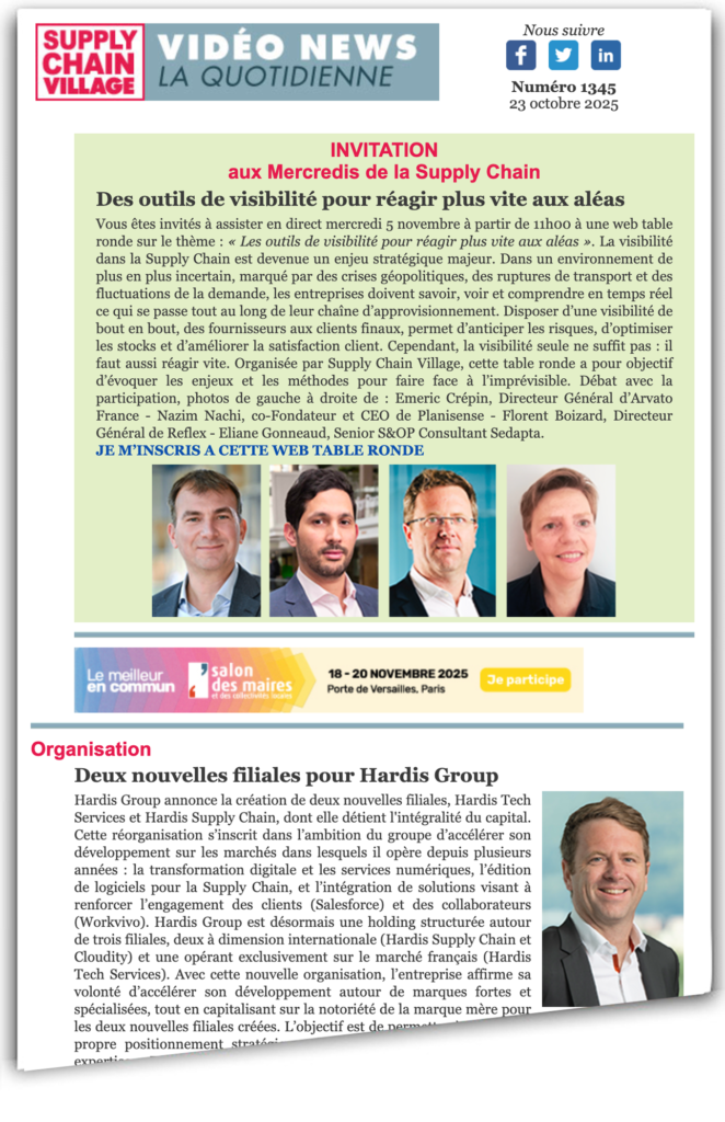 Hardis Group annonce la création de deux nouvelles filiales, Hardis Tech Services et Hardis Supply Chain, dont elle détient l’intégralité du capital. Cette réorganisation s’inscrit dans l’ambition du groupe d’accélérer son développement sur les marchés dans lesquels il opère depuis plusieurs années : la transformation digitale et les services numériques, l’édition de logiciels pour la Supply Chain, et l’intégration de solutions visant à renforcer l’engagement des clients (Salesforce) et des collaborateurs (Workvivo). Hardis Group est désormais une holding structurée autour de trois filiales, deux à dimension internationale (Hardis Supply Chain et Cloudity) et une opérant exclusivement sur le marché français (Hardis Tech Services). Avec cette nouvelle organisation, l’entreprise affirme sa volonté d’accélérer son développement autour de marques fortes et spécialisées, tout en capitalisant sur la notoriété de la marque mère pour les deux nouvelles filiales créées. L’objectif est de permettre à chaque marque de disposer de son propre positionnement stratégique, de renforcer son image de marque et de valoriser ses expertises. Dns ce contexte Stéphane Cotet prend la tête de Hardis Tech Services, où il capitalisera sur son expertise dans les services IT et la transformation digitale. Florent Boizard assure la direction de Hardis Supply Chain, avec pour principale mission de poursuivre le développement à l’international de l’entité. Enfin, Olivier Ribeyre pilote Cloudity France, tandis que Pawel Sobczak dirige Cloudity en Europe centrale et dans la région DACH. « Cette nouvelle organisation nous permet de franchir une nouvelle étape dans la mise en œuvre de notre stratégie : devenir un acteur de référence dans chacun de nos domaines d’expertise. Elle facilitera également l’acquisition de nouvelles structures ciblées », indique Nicolas Odet, président de Hardis Group. JPG