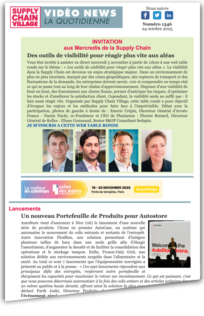 AutoStore vient d’annoncer à Nice (06) le lancement d’une nouvelle série de produits. Citons en premier AutoCase, un système qui automatise le mouvement de colis entrants et sortants de l’entrepôt. Autre innovation FlexBins, une solution permettant d’intégrer plusieurs tailles de bacs dans une seule grille afin d’élargir l’assortiment, d’augmenter la densité et de faciliter la consolidation des opérations et le stockage tampon. Enfin, Frozen-Only Grid, une solution dédiée aux environnements surgelés dans l’alimentaire et la santé. Au total ce sont 7 lancements que l’équipementier norvégien a présenté au public et à la presse : « Ces sept lancements répondent aux principaux défis des entrepôts, renforcent notre portefeuille et élargissent les capacités pour maximiser le retour sur investissement. Ce qui est puissant, c’est que nous pouvons désormais automatiser à la fois des colis entiers et des articles unitaires dans un même système haute densité, offrant ainsi la solution la plus avancée de sa génération », a déclaré Parth Joshi, Directeur Produits chez AutoStore. Le reportage complet de l’événement ainsi que des interviews exclusifs dans cette Newsletter à partir du 3 novembre. JPG