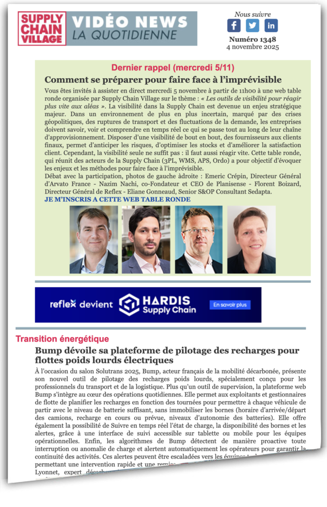 À l’occasion du salon Solutrans 2025, Bump, acteur français de la mobilité décarbonée, présente son nouvel outil de pilotage des recharges poids lourds, spécialement conçu pour les professionnels du transport et de la logistique. Plus qu’un outil de supervision, la plateforme web Bump s’intègre au cœur des opérations quotidiennes. Elle permet aux exploitants et gestionnaires de flotte de planifier les recharges en fonction des tournées pour permettre à chaque véhicule de partir avec le niveau de batterie suffisant, sans immobiliser les bornes (horaire d’arrivée/départ des camions, recharge en cours ou prévue, niveaux d’autonomie des batteries). Elle offre également la possibilité de Suivre en temps réel l’état de charge, la disponibilité des bornes et les alertes, grâce à une interface de suivi accessible sur tablette ou mobile pour les équipes opérationnelles. Enfin, les algorithmes de Bump détectent de manière proactive toute interruption ou anomalie de charge et alertent automatiquement les opérateurs pour garantir la continuité des activités. Ces alertes peuvent être escaladées vers les équipes techniques de Bump, permettant une intervention rapide et une remise en service sans impact sur les tournées. Tom Lyonnet, expert décarbonation, directeur marché transport chez Bump, participera à la conférence de l’Agora Solutrans sur le thème « Infrastructures : la recharge, l’enjeu incontournable pour l’électrique », le vendredi 21 novembre 2025 à 14h00. JPG