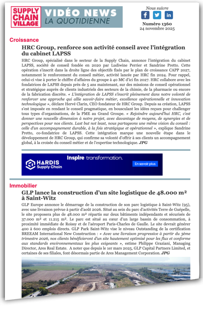 HRC Group, spécialisé dans le secteur de la Supply Chain, annonce l’intégration du cabinet LAPSS, société de conseil fondée en 2020 par Ludiwine Perrier et Sandrine Pretto. Cette opération s’inscrit dans la droite ligne des objectifs fixés par le plan de croissance CAPP 2027, notamment le renforcement du conseil métier, activité lancée par HRC fin 2024. Pour rappel, celui-ci vise à porter le chiffre d’affaires du groupe à 40 M€ d’ici fin 2027. HRC collabore avec les fondatrices de LAPSS depuis près de 5 ans maintenant, sur des missions de conseil opérationnel et stratégique auprès de clients industriels des secteurs de la chimie, de la pharmacie ou encore de la fabrication discrète. « L’intégration de LAPSS s’inscrit pleinement dans notre volonté de renforcer une approche qui allie savoir-faire métier, excellence opérationnelle et innovation technologique », déclare Hervé Clarin, CEO fondateur de HRC Group. Depuis sa création, LAPSS s’est imposée en rendant le conseil pragmatique, en bousculant les idées reçues pour challenger tous types d’organisations, de la PME au Grand Groupe. « Rejoindre aujourd’hui HRC, c’est donner une nouvelle dimension à notre projet, avec davantage de moyens, de synergies et de perspectives pour nos clients. Last but not least, nous partageons une même vision du conseil : celle d’un accompagnement durable, à la fois stratégique et opérationnel », explique Sandrine Pretto, co-fondatrice de LAPSS. Cette intégration marque une nouvelle étape dans le développement de HRC Group, qui confirme sa volonté d’offrir à ses clients un accompagnement global, à la croisée du conseil métier et de l’expertise technologique. JPG