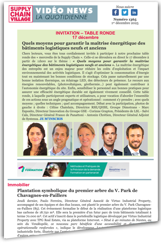 Jeudi dernier, Paulo Ferreira, Directeur Général Associé de Virtuo Industrial Property, accompagné de ses équipes et des élus locaux, ont planté le premier arbre du V. Park Chavagnes-en-Paillers (85). Cet événement formalise le début de la réalisation d’une plateforme logistique bas carbone de 18.750 m². Elle sera la première d’un futur parc de trois bâtiments totalisant à terme 70.000 m². Cet actif s’inscrit dans le portefeuille logistique développé par Virtuo Industrial Property avec TPG Real Estate, via sa plateforme Intervest. « Situé à 40 minutes de Nantes, au sein du Vendéopôle, ce nouveau parc bénéficie d’une accessibilité et d’une efficacité opérationnelle renforcées », indique le développeur. Le territoire connaît une dynamique industrielle forte, illustrée par l’arrivée récente de groupes comme Maître Coq et VST, ainsi que d’autres entreprises en développement. Sur le plan environnemental, Virtuo porte une ambition élevée dès la conception. Le bâtiment est conforme à la réglementation ICPE 1510 et vise la certification BREEAM Excellent, avec une attention portée à la performance énergétique, à la gestion de l’eau et à l’intégration paysagère. L’objectif est de livrer un outil logistique performant, qui limite son empreinte et valorise la biodiversité locale. Les travaux ont démarré le 30 juin dernier pour une livraison prévue au 2ème trimestre 2026. JPG