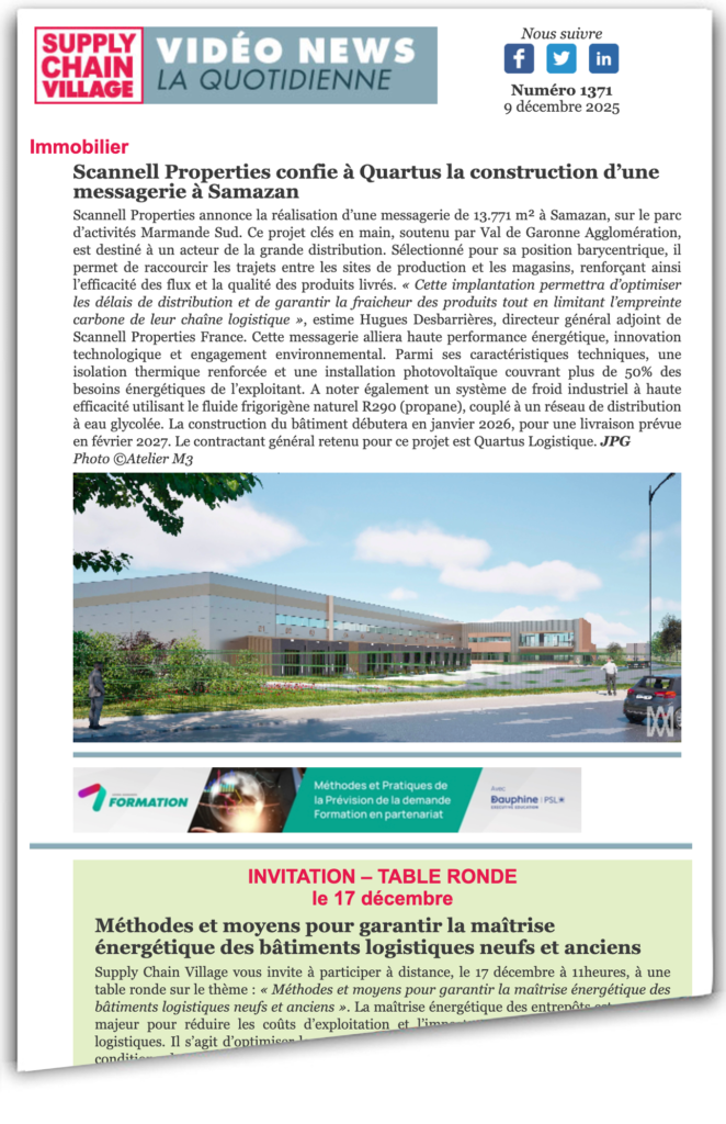 Scannell Properties annonce la réalisation d’une messagerie de 13.771 m² à Samazan, sur le parc d’activités Marmande Sud. Ce projet clés en main, soutenu par Val de Garonne Agglomération, est destiné à un acteur de la grande distribution. Sélectionné pour sa position barycentrique, il permet de raccourcir les trajets entre les sites de production et les magasins, renforçant ainsi l’efficacité des flux et la qualité des produits livrés. « Cette implantation permettra d’optimiser les délais de distribution et de garantir la fraicheur des produits tout en limitant l’empreinte carbone de leur chaîne logistique », estime Hugues Desbarrières, directeur général adjoint de Scannell Properties France. Cette messagerie alliera haute performance énergétique, innovation technologique et engagement environnemental. Parmi ses caractéristiques techniques, une isolation thermique renforcée et une installation photovoltaïque couvrant plus de 50% des besoins énergétiques de l’exploitant. A noter également un système de froid industriel à haute efficacité utilisant le fluide frigorigène naturel R290 (propane), couplé à un réseau de distribution à eau glycolée. La construction du bâtiment débutera en janvier 2026, pour une livraison prévue en février 2027. Le contractant général retenu pour ce projet est Quartus Logistique. JPG