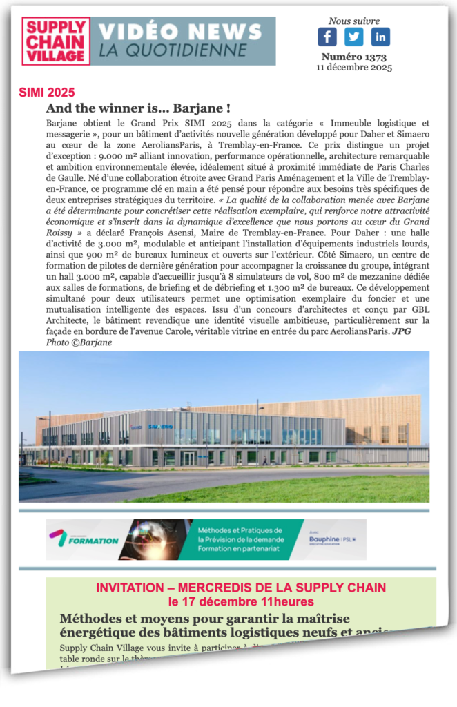 Barjane obtient le Grand Prix SIMI 2025 dans la catégorie « Immeuble logistique et messagerie », pour un bâtiment d’activités nouvelle génération développé pour Daher et Simaero au cœur de la zone AeroliansParis, à Tremblay-en-France. Ce prix distingue un projet d’exception : 9.000 m² alliant innovation, performance opérationnelle, architecture remarquable et ambition environnementale élevée, idéalement situé à proximité immédiate de Paris Charles de Gaulle. Né d’une collaboration étroite avec Grand Paris Aménagement et la Ville de Tremblay-en-France, ce programme clé en main a été pensé pour répondre aux besoins très spécifiques de deux entreprises stratégiques du territoire. « La qualité de la collaboration menée avec Barjane a été déterminante pour concrétiser cette réalisation exemplaire, qui renforce notre attractivité économique et s’inscrit dans la dynamique d’excellence que nous portons au cœur du Grand Roissy, » a déclaré François Asensi, Maire de Tremblay-en-France. Pour Daher : une halle d’activité de 3.000 m², modulable et anticipant l’installation d’équipements industriels lourds, ainsi que 900 m² de bureaux lumineux et ouverts sur l’extérieur. Côté Simaero, un centre de formation de pilotes de dernière génération pour accompagner la croissance du groupe, intégrant un hall 3.000 m², capable d’accueillir jusqu’à 8 simulateurs de vol, 800m² de mezzanine dédiée aux salles de formations, de briefing et de débriefing et 1.300 m² de bureaux. Ce développement simultané pour deux utilisateurs permet une optimisation exemplaire du foncier et une mutualisation intelligente des espaces. Issu d’un concours d’architectes et conçu par GBL Architecte, le bâtiment revendique une identité visuelle ambitieuse, particulièrement sur la façade en bordure de l’avenue Carole, véritable vitrine en entrée du parc AeroliansParis. JPG