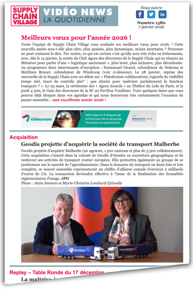 Geodis projette d’acquérir Malherbe (40 agences, 1.500 camions et plus de 3.300 collaborateurs). Cette acquisition s’inscrit dans la volonté de Geodis d’étendre sa couverture géographique et de renforcer ses activités de transport routier européen. Elle permettra également au groupe de se positionner sur le marché de l’agroalimentaire. Dans le domaine du transport en demi-lots et lots complets, ce nouvel ensemble représenterait un chiffre d’affaires cumulé d’environ 2 milliards d’euros de CA. La transaction deviendra effective à l’issue de la finalisation des formalités réglementaires d’usage. JPG