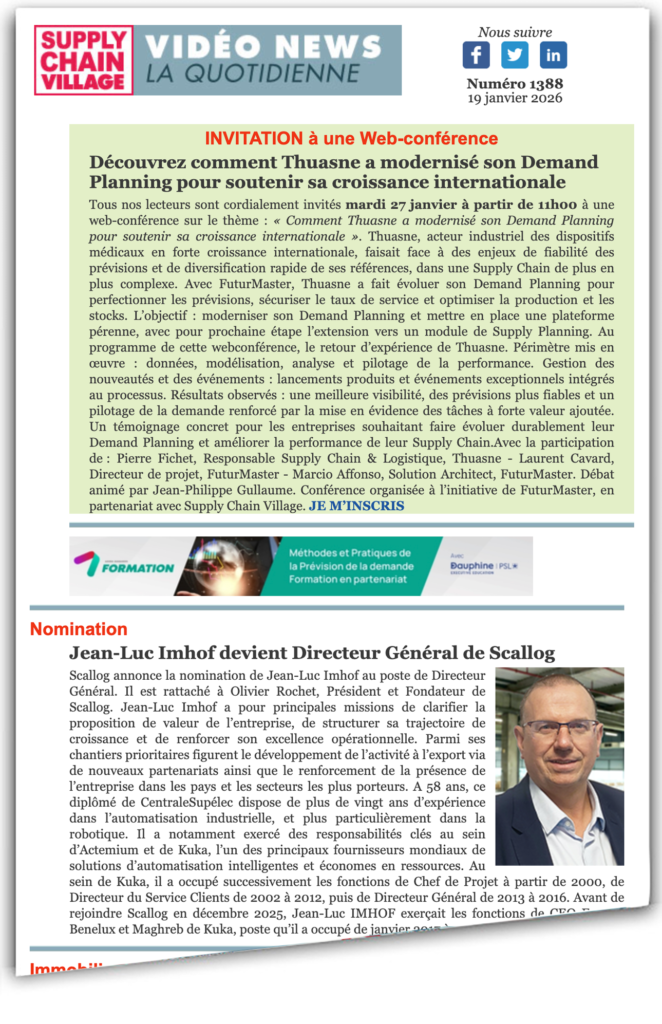 Scallog annonce la nomination de Jean-Luc Imhof au poste de Directeur Général. Il est rattaché à Olivier Rochet, Président et Fondateur de Scallog. Jean-Luc Imhof a pour principales missions de clarifier la proposition de valeur de l’entreprise, de structurer sa trajectoire de croissance et de renforcer son excellence opérationnelle. Parmi ses chantiers prioritaires figurent le développement de l’activité à l’export via de nouveaux partenariats ainsi que le renforcement de la présence de l’entreprise dans les pays et les secteurs les plus porteurs. A 58 ans, ce diplômé de CentraleSupélec dispose de plus de vingt ans d’expérience dans l’automatisation industrielle, et plus particulièrement dans la robotique. Il a notamment exercé des responsabilités clés au sein d’Actemium et de Kuka, l’un des principaux fournisseurs mondiaux de solutions d’automatisation intelligentes et économes en ressources. Au sein de Kuka, il a occupé successivement les fonctions de Chef de Projet à partir de 2000, de Directeur du Service Clients de 2002 à 2012, puis de Directeur Général de 2013 à 2016. Avant de rejoindre Scallog en décembre 2025, Jean-Luc IMHOF exerçait les fonctions de CEO France, Benelux et Maghreb de Kuka, poste qu’il a occupé de janvier 2017 à avril 2025. JPG