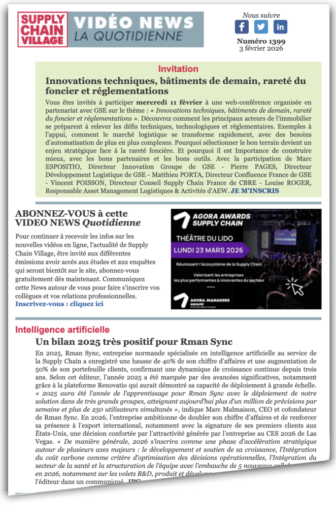 En 2025, Rman Sync, entreprise normande spécialisée en intelligence artificielle au service de la Supply Chain a enregistré une hausse de 40 % de son chiffre d’affaires et une augmentation de 50% de son portefeuille clients, confirmant une dynamique de croissance continue depuis trois ans. Selon cet éditeur, l’année 2025 a été marquée par des avancées significatives, notamment grâce à la plateforme Renovatio qui aurait démontré sa capacité de déploiement à grande échelle. « 2025 aura été l’année de l’apprentissage pour Rman Sync avec le déploiement de notre solution dans de très grands groupes, atteignant aujourd’hui plus d’un million de prévisions par semaine et plus de 250 utilisateurs simultanés », indique Marc Malmaison, CEO et cofondateur de Rman Sync. En 2026, l’entreprise ambitionne de doubler son chiffre d’affaires et de renforcer sa présence à l’export international, notamment avec la signature de ses premiers clients aux États-Unis, une décision confortée par l’attractivité générée par l’entreprise au CES 2026 de Las Vegas. « De manière générale, 2026 s’inscrira comme une phase d’accélération stratégique autour de plusieurs axes majeurs : le développement et soutien de sa croissance, l’Intégration du coût carbone comme critère d’optimisation des décisions opérationnelles, l’Intégration du secteur de la santé et la structuration de l’équipe avec l’embauche de 5 nouveaux collaborateurs en 2026, notamment sur les volets R&D, produit et développement commercial », précise encore l’éditeur dans un communiqué. JPG