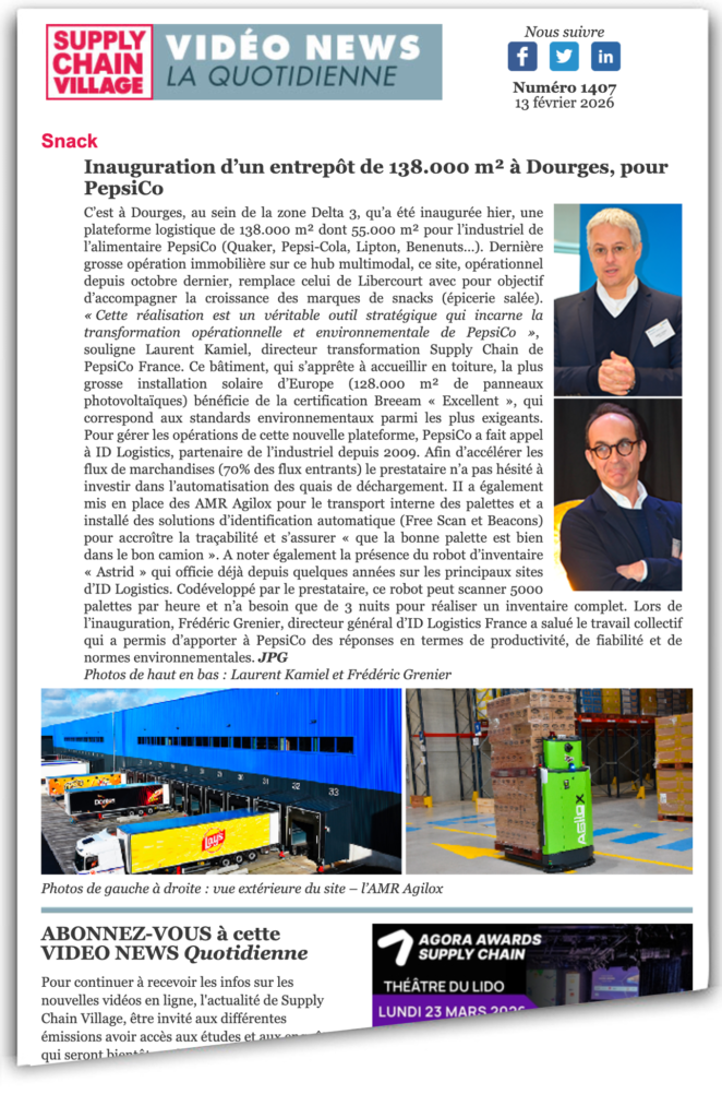 Afin d’accélérer les flux de marchandises (70% des flux entrants) le prestataire n’a pas hésité à investir dans l’automatisation des quais de déchargement. II a également mis en place des AMR Agilox pour le transport interne des palettes et a installé des solutions d’identification automatique (Free Scan et Beacons) pour accroître la traçabilité et s’assurer « que la bonne palette est bien dans le bon camion ». A noter également la présence du robot d’inventaire « Astrid » qui officie déjà depuis quelques années sur les principaux sites d’ID Logistics. Codéveloppé par le prestataire, ce robot peut scanner 5.000 palettes par heure et n’a besoin que de 3 nuits pour réaliser un inventaire complet. Lors de l’inauguration, Frédéric Grenier, directeur général d’ID Logistics France a salué le travail collectif qui a permis d’apporter à PepsiCo des réponses en termes de productivité, de fiabilité et de normes environnementales. JPG