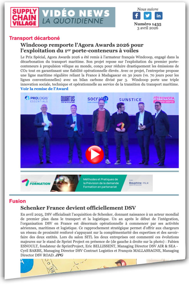 En avril 2025, DSV officialisait l’acquisition de Schenker, donnant naissance à un acteur mondial de premier plan dans le transport et la logistique. Un an après le début de l’intégration, l’organisation DSV en France est désormais opérationnelle à commencer par ses activités aériennes, maritimes et logistique. Ce rapprochement stratégique permet d’offrir aux chargeurs un réseau de proximité renforcé s’appuyant sur la complémentarité des expertises et des savoir-faire des deux entités. Lors du salon SITL les deux entreprises ont commenté ces évolutions majeures sur le stand de Sprint Project en présence de (de gauche à droite sur la photo) : Fabien ESNOULT, fondateur de SprintProject, Eric BELLISSENT – Managing Director DSV AIR & SEA, Cyril BARBE – Managing Director DSV Contract Logistics et François MALLASSAGNE – Managing Director DSV ROAD. JPG