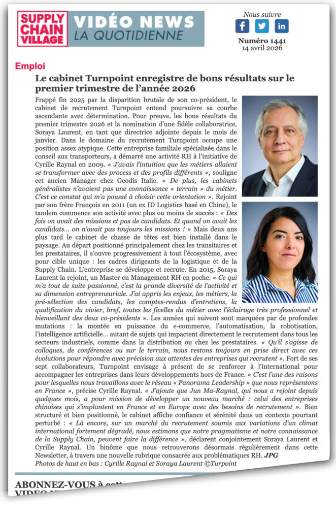 Frappé fin 2025 par la disparition brutale de son co-président, le cabinet de recrutement Turnpoint entend poursuivre sa courbe ascendante avec détermination. Pour preuve, les bons résultats du premier trimestre 2026 et la nomination d’une fidèle collaboratrice, Soraya Laurent, en tant que directrice adjointe depuis le mois de janvier. Dans le domaine du recrutement Turnpoint occupe une position assez atypique. Cette entreprise familiale spécialisée dans le conseil aux transporteurs, a démarré une activité RH à l’initiative de Cyrille Raynal en 2009. « J’avais l’intuition que les métiers allaient se transformer avec des process et des profils différents », souligne cet ancien Manager chez Geodis Italie. « De plus, les cabinets généralistes n’avaient pas une connaissance « terrain » du métier. C’est ce constat qui m’a poussé à choisir cette orientation ». Rejoint par son frère François en 2011 (un ex ID Logistics basé en Chine), le tandem commence son activité avec plus ou moins de succès : « Des fois on avait des missions et pas de candidats. Et quand on avait les candidats… on n’avait pas toujours les missions ! »…