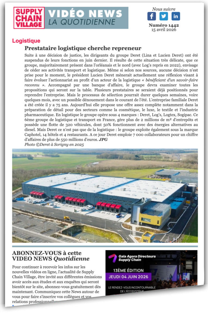 Suite à une décision de justice, les dirigeants du groupe Deret (Lina et Lucien Deret) ont été suspendus de leurs fonctions en juin dernier. Il résulte de cette situation très délicate, que ce groupe, majoritairement présent dans l’orléanais et le nord (avec Log’s repris en 2022), envisage de céder ses activités transport et logistique. Même si selon nos sources, aucune décision n’est prise pour le moment, le président Lucien Deret mènerait actuellement une réflexion visant à faire évoluer l’actionnariat au profit d’un acteur de la logistique « bénéficiant d’un savoir-faire reconnu ». Accompagné par une banque d’affaire, le groupe devra examiner toutes les propositions qui seront sur la table. Plusieurs prestataires se seraient déjà positionnés pour reprendre l’entreprise. Mais le processus de sélection pourrait durer quelques semaines, voire quelques mois, avec un possible dénouement dans le courant de l’été. L’entreprise familiale Deret a été créée il y a 75 ans. Aujourd’hui elle propose une offre assez complète notamment dans la préparation de détail pour des secteurs comme la cosmétique, le luxe, le textile et l’industrie pharmaceutique. En logistique le groupe opère sous 4 marques : Deret, Log’s, Logtex, Sogipac. Ce 6ème groupe de logistique et transport en France, gère plus de 2 millions de m² d’entrepôts et possède une flotte de 320 véhicules, dont 50% fonctionnent avec des énergies alternatives au diesel. Mais Deret ce n’est pas que de la logistique : le groupe exploite également sous la marque Caphotel, 14 hôtels et 4 restaurants. A ce jour Deret emploie 7.000 collaborateurs pour un chiffre d’affaires de plus de 550 millions d’euros. JPG