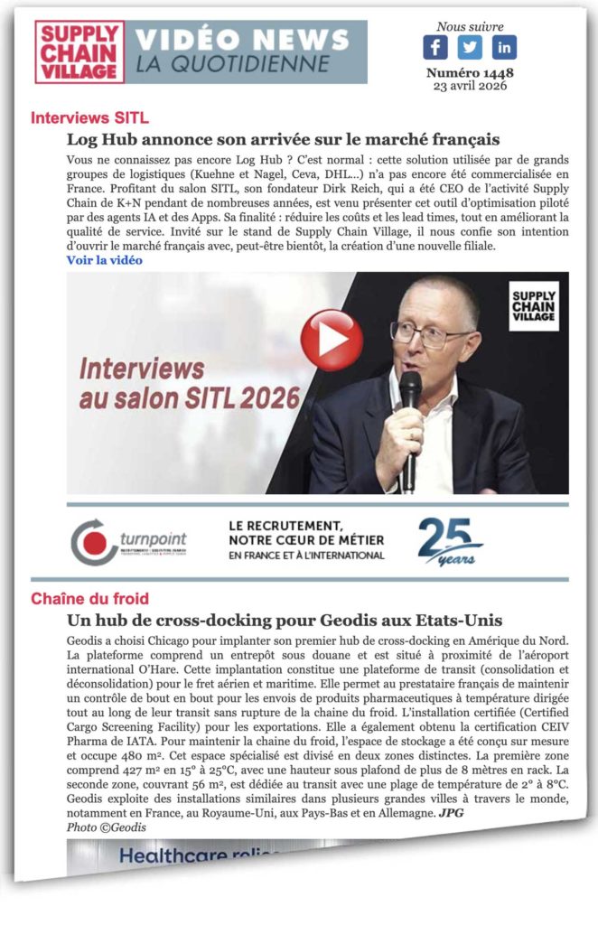 Geodis a choisi Chicago pour implanter son premier hub de cross-docking en Amérique du Nord. La plateforme comprend un entrepôt sous douane et est situé à proximité de l’aéroport international O’Hare. Cette implantation constitue une plateforme de transit (consolidation et déconsolidation) pour le fret aérien et maritime. Elle permet au prestataire français de maintenir un contrôle de bout en bout pour les envois de produits pharmaceutiques à température dirigée tout au long de leur transit sans rupture de la chaine du froid. L’installation certifiée (Certified Cargo Screening Facility) pour les exportations. Elle a également obtenu la certification CEIV Pharma de IATA. Pour maintenir la chaine du froid, l’espace de stockage a été conçu sur mesure et occupe 480 m². Cet espace spécialisé est divisé en deux zones distinctes. La première zone comprend 427 m² en 15° à 25°C, avec une hauteur sous plafond de plus de 8 mètres en rack. La seconde zone, couvrant 56 m², est dédiée au transit avec une plage de température de 2° à 8°C. Geodis exploite des installations similaires dans plusieurs grandes villes à travers le monde, notamment en France, au Royaume-Uni, aux Pays-Bas et en Allemagne. JPG