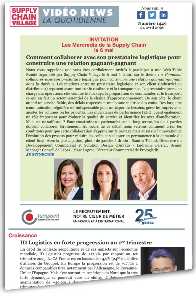 En dépit du contexte géopolitique et de ses impacts sur l’économie mondiale, ID Logistics progresse de +17,2% par rapport au 1er trimestre 2025. Le CA France est en hausse de +4,9% (24% du chiffre d’affaires du Groupe). En Europe la progression est de +17,3% à données comparables tirée notamment par l’Allemagne, le Royaume-Uni et l’Espagne. Mais c’est surtout en Amérique du Nord que la très forte dynamique se poursuit avec un chiffre d’affaires en nette augmentation de +40,6% à données comparables. Au cours du trimestre écoulé, ID Logistics a démarré 5 nouveaux dossiers : En France, dans la cosmétique avec SVR, marque du groupe KRESK (un site de 16.000 m² au sud de Paris). En Italie, ID Logistics a ouvert un site de 60.000 m² pour Michelin. Aux États-Unis, le prestataire et Nutrabolt, ouvrent un nouveau site de 37.000 m² dans le Wisconsin. Enfin au Brésil, le 3PL français signe un partenariat avec un grand acteur du commerce en ligne et démarre plusieurs opérations représentant plus de 40.000 m² de surface opérationnelle et 750 emplois au total. « Dans la continuité de l’année 2025, ID Logistics réalise un bon début d’exercice 2026 avec un premier trimestre en croissance de 17,2%, à taux de change constants. L’activité du Groupe, centrée sur le stockage, la préparation de commandes et les services à valeur ajoutée est faiblement consommatrice d’énergie et, démontre une forte résilience dans un environnement économique incertain. Porté par un bon niveau de croissance embarquée et une dynamique commerciale soutenue, ID Logistics confirme sa capacité à poursuivre une trajectoire de fort développement en 2026 », souligne Eric Hémar, président-fondateur de l’entreprise. JPG