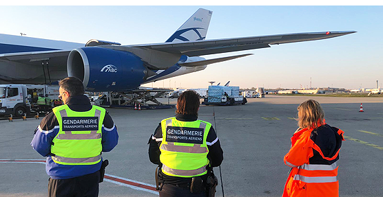| « Pour réaliser cette opération BBA n'a pas besoin d'intermédiaire. C'est directement et sans le concours d'un broker que nous avons affrété un Boeing 747 – 800 auprès d'Air Bridge, une compagnie qui propose des vols charters », explique Jean-Philippe Le Coat. Il faut savoir que dans ce contexte où les compagnies aériennes traditionnelles sont clouées au sol, les moyens de transport sont rares et chers. « Il faut vraiment se battre pour avoir un avion ! » commente le président de BBA. « De plus il faut payer d'avance. Même chose pour la marchandise, qui fait l'objet d'une surenchère sauvage, y compris au pied de l'avion. Et pourtant début avril, le premier avion affrété par BBA se pose à Roissy avec à son bord une cargaison de 21,4 millions de masques médicaux, soit 10.700 colis sur 51 palettes avion (800 mètres cube) que l'équipe décharge sur des palettes bois. Une opération hyper sécurisée qui se déroule pendant toute la nuit sous escorte policière ».. Photo : déchargement sous escorte policière. |